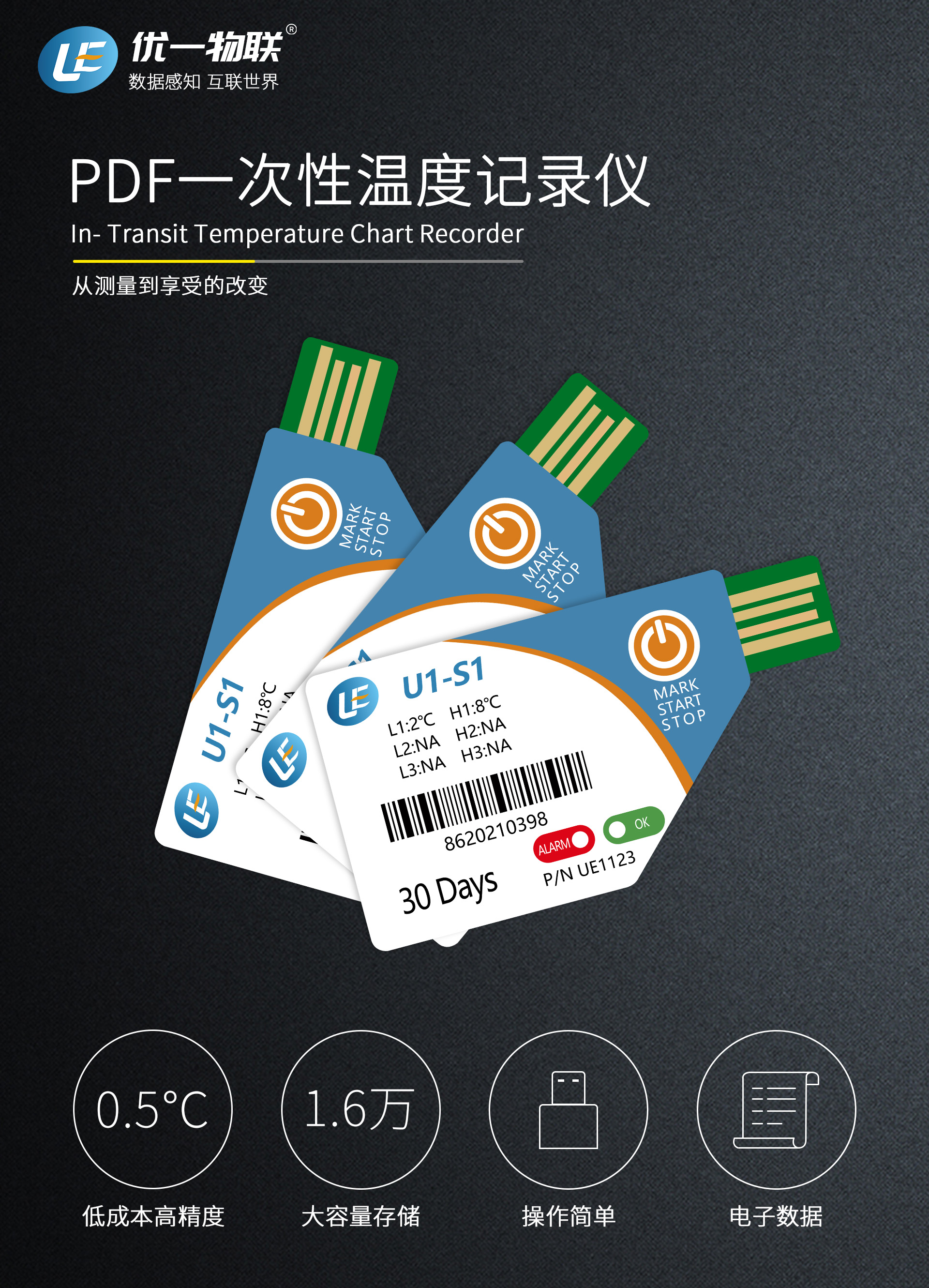 U1-S1是一款應(yīng)用于生物醫(yī)藥箱,集裝箱,冷藏車等場景的一次性PDF溫度記錄儀,高精度,大容量,生成報(bào)告表速度快,操作簡單,只需按動(dòng)一個(gè)按鈕便可啟動(dòng)記錄,常用于低成本跟蹤監(jiān)測冷鏈運(yùn)輸、食品藥品或其它溫度敏感貨物的運(yùn)輸安全。